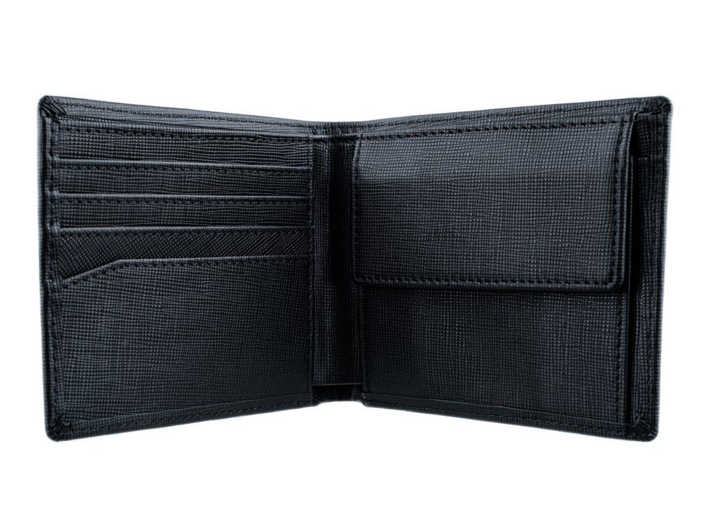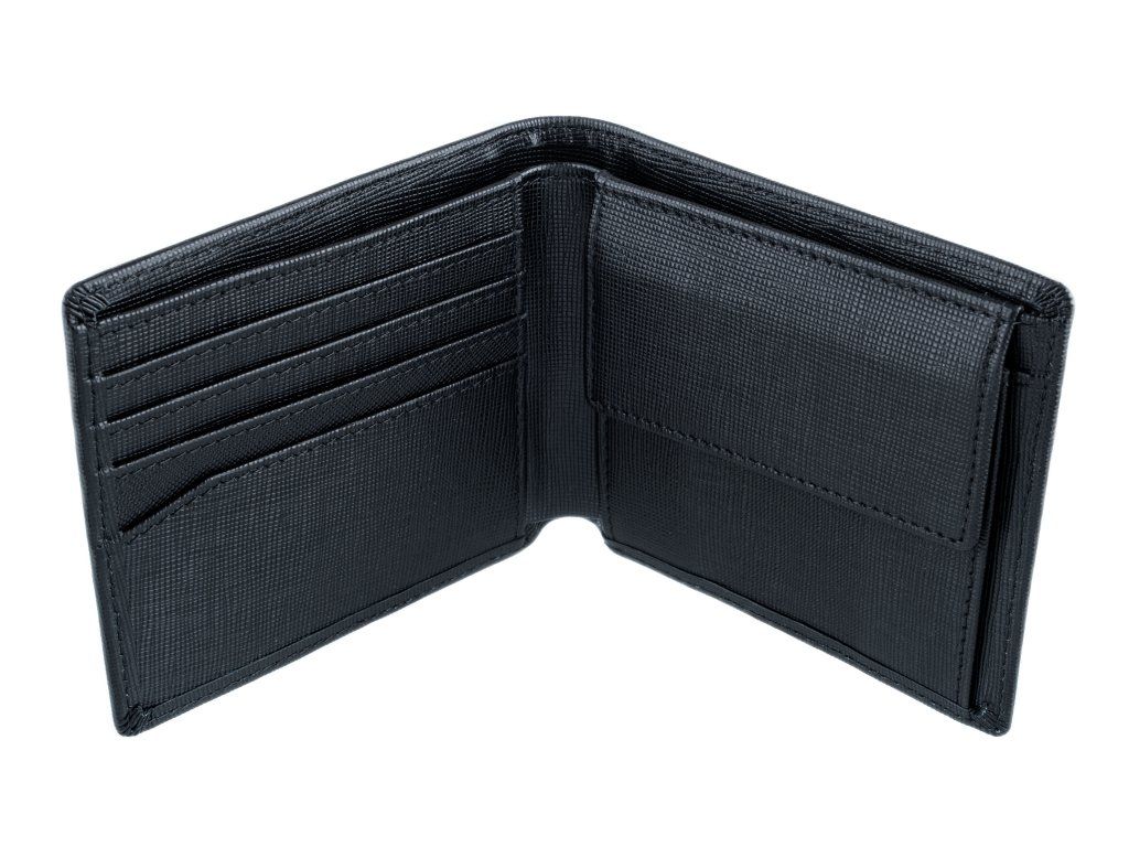 - Kompaktní uspořádání – sloty na karty, přihrádka na bankovky a kapsa na mince v jednom.