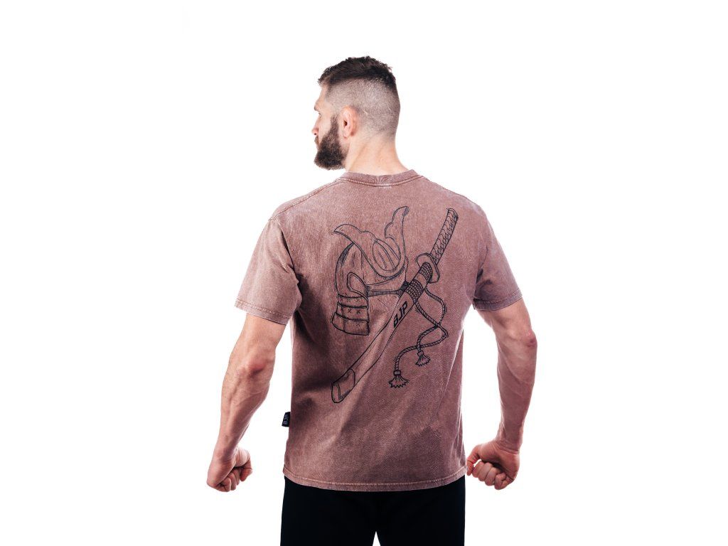 Dominantou zad je ručně kreslená grafika samurajské přilby a katany s BJP logem na čepeli — symbol toho, že tvůj boj je precizní, záměrný a vedený s respektem k řemeslu. Na hrudi nosíš jen BJP — čisté, jednoduché, bez zbytečného hluku. Zemitá hnědá v acid wash provedení dává tričku charakter, který se nedá napodobit.