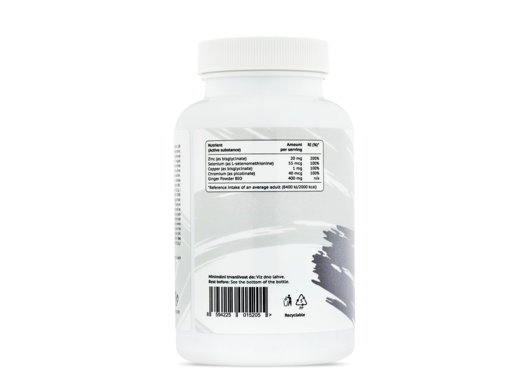 BJP Zinc Bisglycinate Complex 20 mg je chytrá kombinace chelátové formy zinku se selenem (L‑selenometionin), mědí (bisglycinát), chromem (pikolinát) a BIO zázvorem. Chelátová forma je obecně dobře tolerovaná a výborně využitelná.