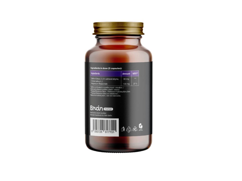 Složení: Extrakt ze šafránu (Crocus sativus L.)(standardizováno na 0,3 % safranalů), Hořčík (bisglycinát hořečnatý). Rostlinná kapsle na bázi HPMC. Bez obsahu balastních látek (éček).