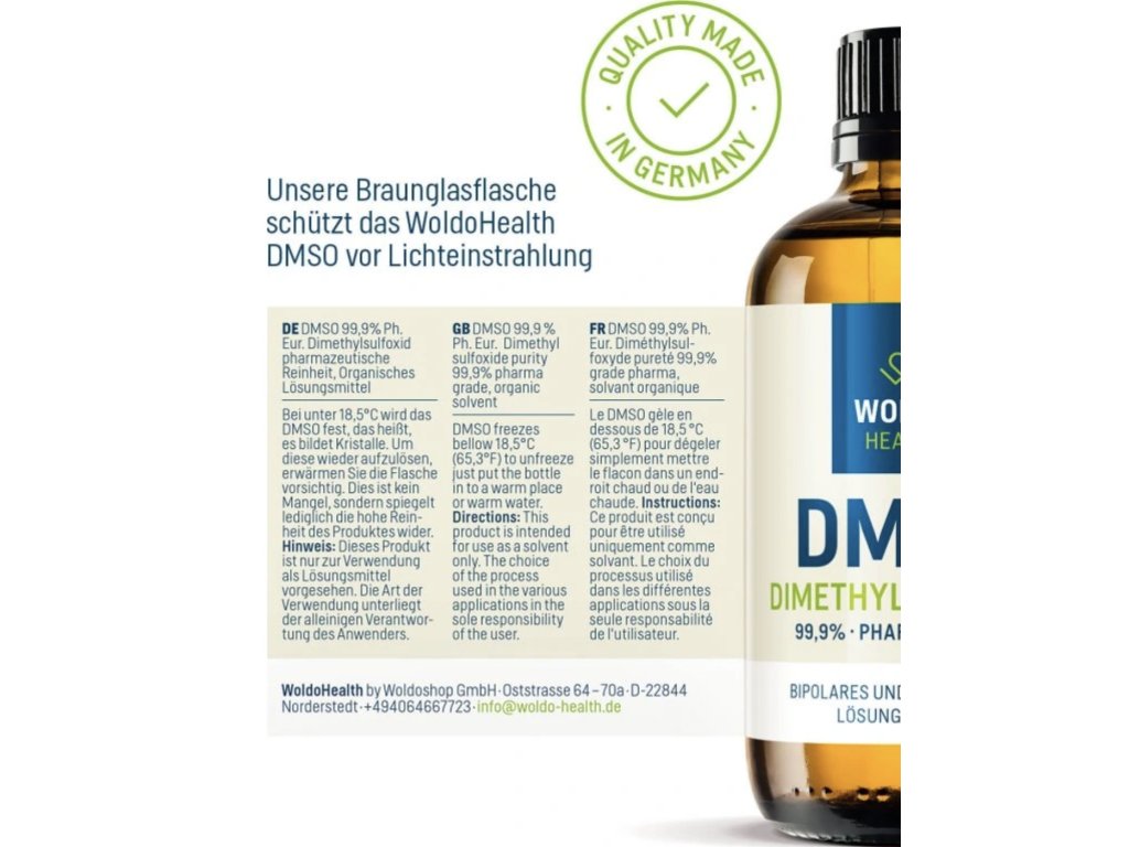 Tento produkt obsahuje 99,9% DMSO ve farmaceutické kvalitě certifikované podle Evropského lékopisu (Ph. Eur.). To znamená přísnou kontrolu každé šarže, výrobu za hygienických podmínek a garantovanou čistotu bez zbytečných přísad. Díky schopnosti fungovat jako nosič lze DMSO kombinovat s dalšími látkami — ředit vodou, přidávat do krémů, mastí nebo sprejů podle zamýšleného použití. Praktické HDPE kapátko umožňuje přesné dávkování bez zbytečného plýtvání.
