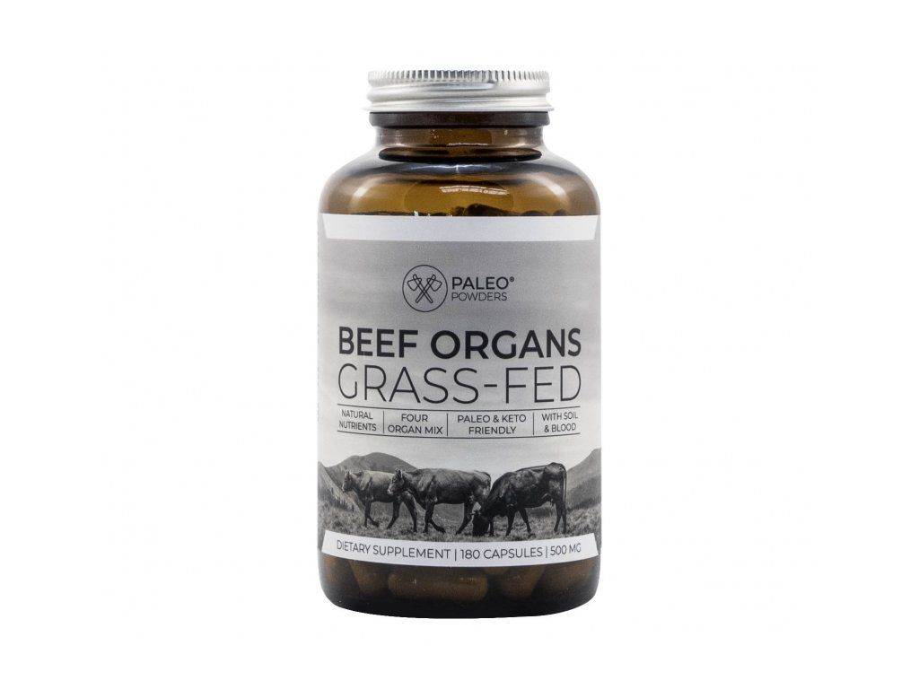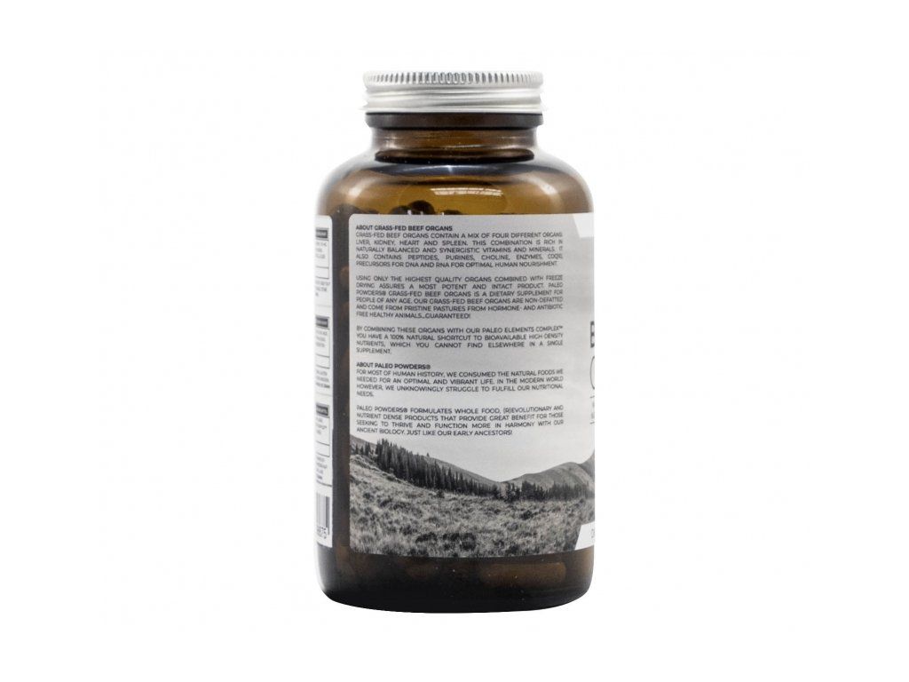 Complete organ nutrition in one capsule. Beef Organs by Paleo Powders is a blend of heart, kidneys, liver, spleen, blood and soil minerals from New Zealand cattle fed exclusively on grass. Raw, freeze-dried to preserve vitamins, minerals and cofactors. With the unique Paleo Elements Complex™ from mineral soil and blood.