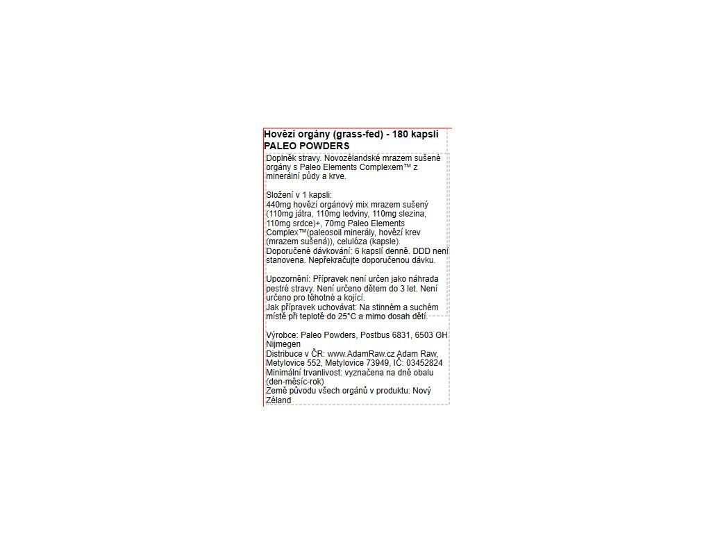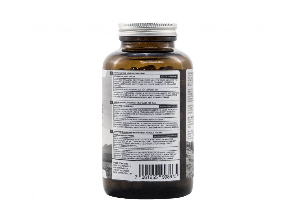 Freeze-dried blend: beef heart, kidneys, liver, spleen, blood. Paleo Elements Complex™ (mineral soil). 180 capsules × 510 mg. No pesticides, fillers, hormones or GMOs.