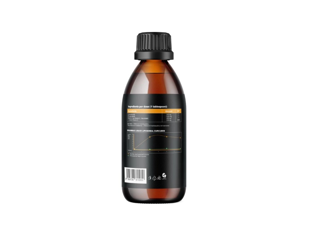 Meet BrainMax Liquid Liposomal Curcumin—an advanced, great-tasting mango formulation designed for superior uptake. Each 10 ml serving provides 200 mg curcuminoids wrapped in phospholipid liposomes (80–300 nm) to help protect the active ingredient through digestion and markedly improve its bioavailability—up to 46.7× versus conventional curcumin. The formula is supported with vitamin C and stabilized using a natural preservation system (vegetable glycerol and standardized rosemary extract) for quality and freshness. Smooth texture, bright mango flavor, and reliable dosing make it easy to include in your daily routine.