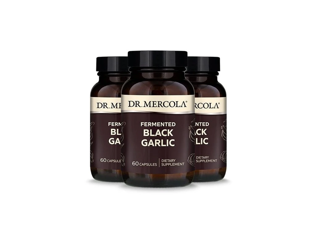 Concentrated fermented black garlic extract by Dr. Mercola. Fermentation transforms regular garlic into a more potent, more digestible form with new bioactive compounds. Declared content of 1.2 mg S-allyl cysteine per 2 capsules — equivalent to approximately 7 cloves of fermented black garlic.