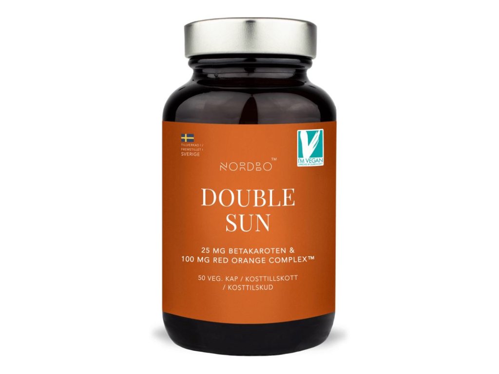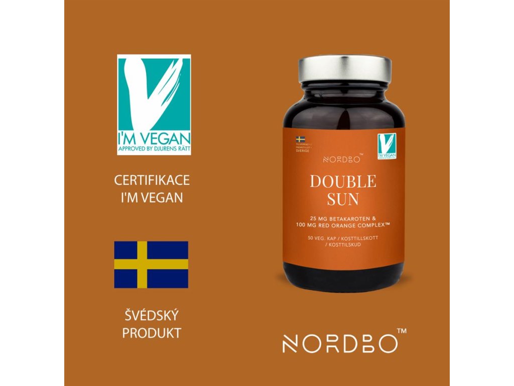 Nordbo Double Sun obsahuje Red Orange ComplexTM extrakt z červeného pomeranče e beta-karoten z mikrořasy Dunaliella salina. Účinky těchto látek souvisí s ochranou před nadměrným slunečním zářením a se stavem pokožky. Beta-karoten dovede chránit před poškozením z UV záření. Část z něj se přemění na vitamín A a část je je uchována v kůži, kde pomáhá delšímu a šetrnějšímu opálení - pokožka je odolnější proti spálení a vysušení. Extrakt z červeného pomeranče obsahuje antioxidanty zvané anthokyany, flavonoidy a vitamín C. Všechny tyto látky mají vlastnosti související s oxidativním stresem vznikajícím při nadměrném vystavení se slunečnímu záření.