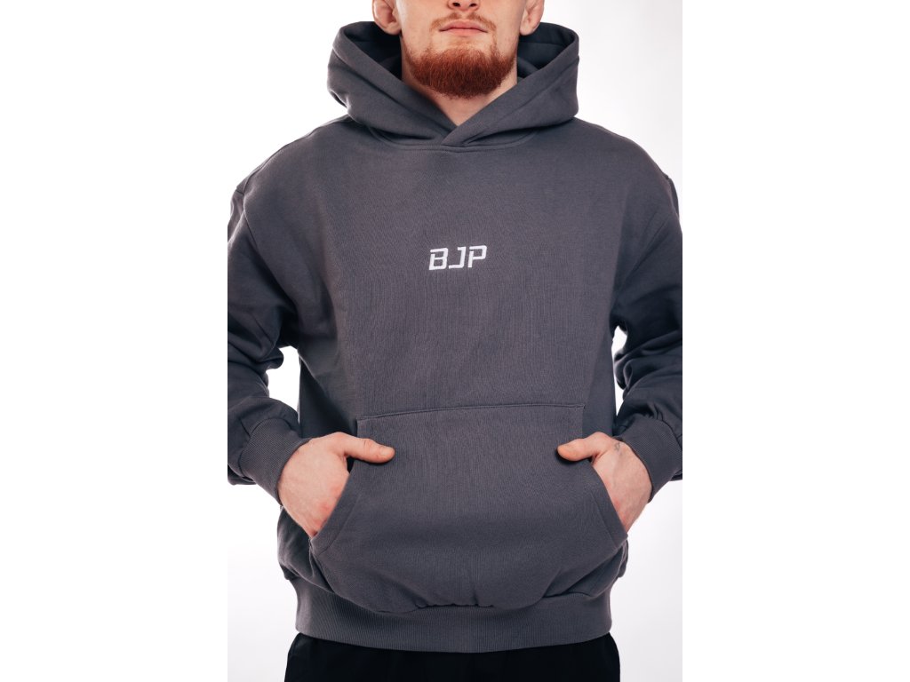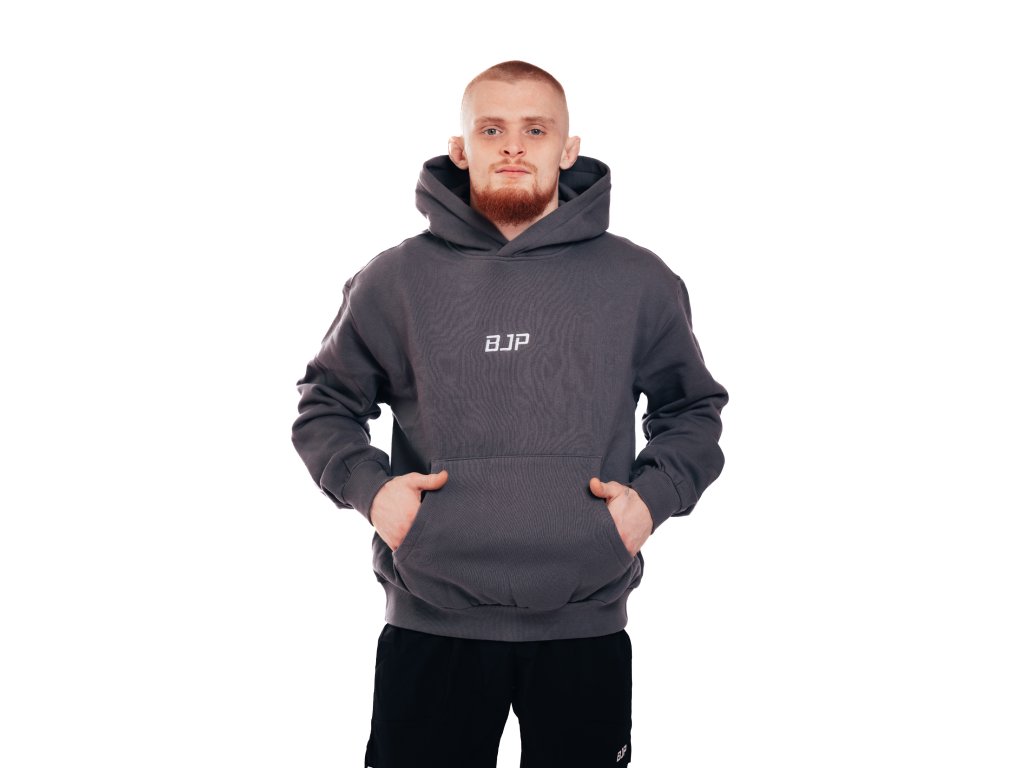 Základná mikina je vrstva, v ktorej zvládneš tréning aj cestu domov. Stredne ťažký CVC flís (80 % bavlna / 20 % recyklovaný polyester) je mäkký, odolný proti žmolkovaniu a vďaka predsrážaniu lepšie drží rozmery. Uvoľnený strih so spadnutým ramenom sedí pohodlne, klokanka na nevyhnutnosti a 2×2 rebro na leme a manžetách držia tvar. Kapucňa je podšitá rovnakou látkou a bez šnúrok pre čistý vzhľad. Odtieň Tmavá šedá (tmavá šedá) sa ľahko kombinuje so všetkým. Filozofia BJP: „Dokážeš čokoľvek. Tu a teraz.“