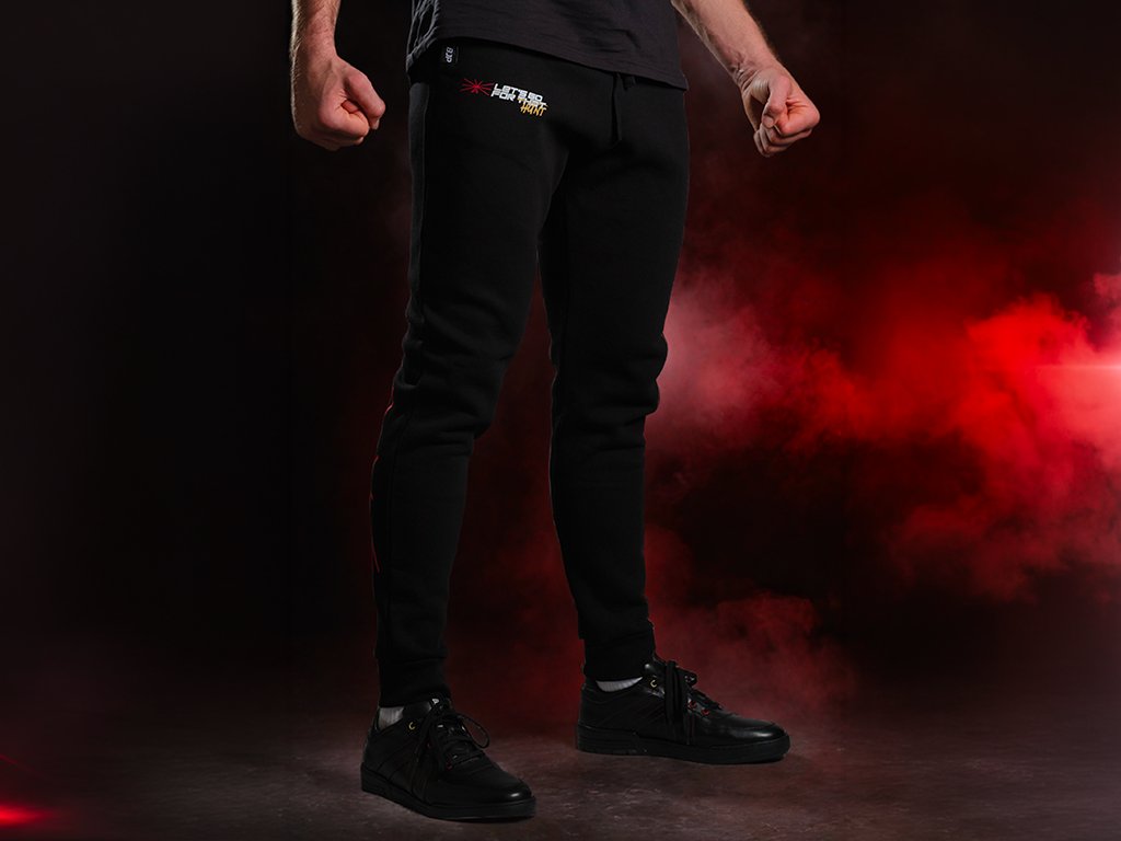 Lov nekončí, keď si zložíš mikinu. Limitované tepláky Let's go for HUNT dotvára kompletnú siluetu kolekcie, ktorá vznikla pri príležitosti titulového zápasu UFC 327 – Procházka vs. Ulberg – o titul majstra sveta v poloťažkej váhe, 11. apríla 2026 v Kaseya Center v Miami. Na pravej strane pri vrecku nesie nápis „Let's go for HUNT", na ľavej strane logo BJP a na pravom lýtku vzadu dominuje červený BJP symbol – podpis lovca, ktorý ide svojou cestou.