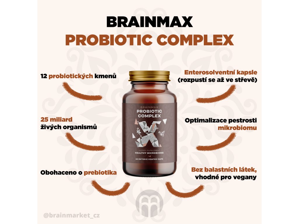 Aktívne probiotické baktérie sa prirodzene vyskytujú v celom tráviacom trakte. Ako celok tvoria tzv. črevný mikrobióm, kde by mali zdraviu prospešné baktérie prevažovať. V prípade nerovnováhy tzv. dysbiózy črevného mikrobiómu dochádza k poruchám trávenia sprevádzaným nepríjemnými príznakmi. BrainMax Probiotic Complex sú probiotiká vhodné na každodenné užívanie a tiež po užívaní antibiotík či pri problémoch v gastrointestinálnom trakte.
