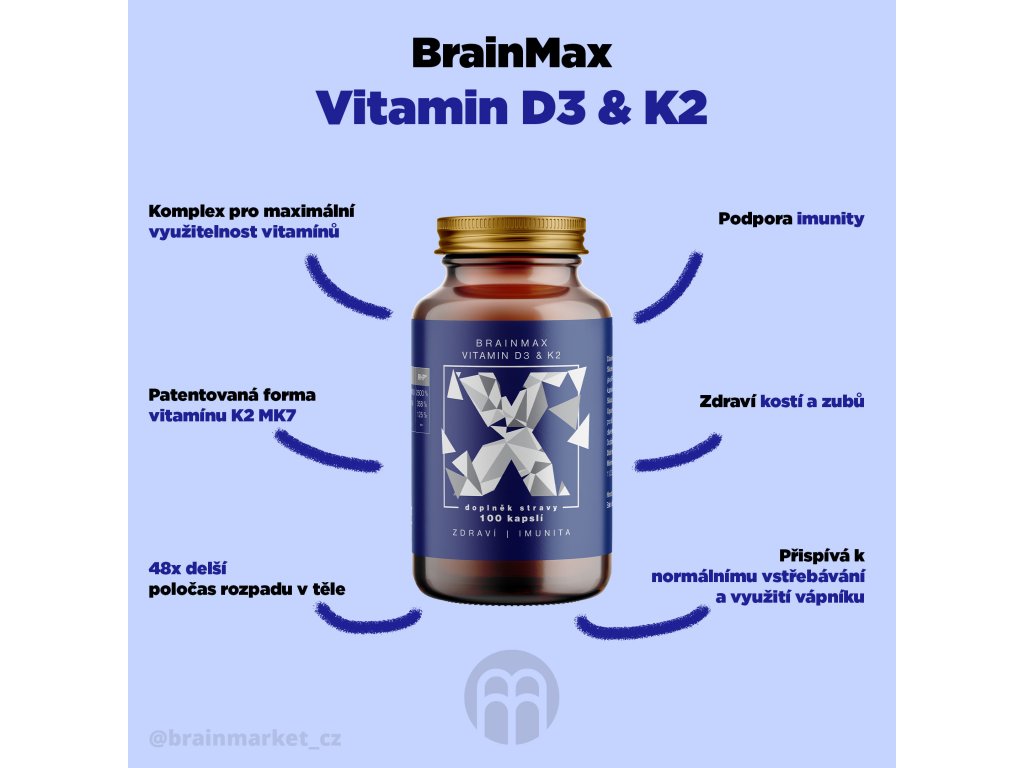 BrainMax Vitamín D3 & K2 kombinuje vitamíny D3 a K2 ako MK7, dve mikroživiny, ktoré boli rozsiahle skúmané pre svoju úlohu v zdraví kostí, zubov a kardiovaskulárneho systému. Vitamín D3 podporuje ukladanie vápnika do kostí, čím zlepšuje zdravie kostí. S vyšším príjmom vitamínu D3 môže súvisieť ukladanie vápnika do ciev (kalcifikácia ciev). Z tohto dôvodu sme k vitamínu D3 pridali vitamín K2 ako MK7, ktorý čistí cievy od vápnika a pomáha ukladať vápnik do kostí. Je to binárna zbraň, absolútna synergia dvoch esenciálnych vitamínov, ktoré sú dôležité pre celkové zdravie. Vitamín D3 si naše telo v lete vytvorí zo slnečného žiarenia, ale vitamín K2 môžeme prijímať iba z potravy. Dosiahnuť však jeho požadovanú dennú potrebu je prakticky nemožné.