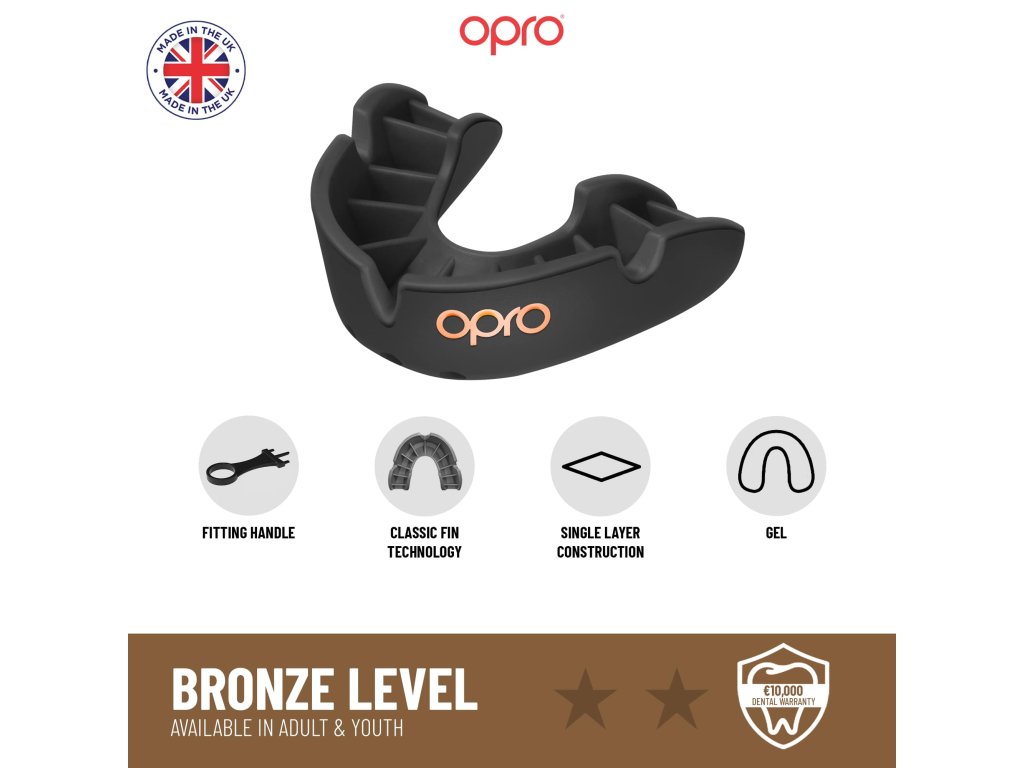 BRONZ - Tréningový stupeň ochrany. Pevná vonkajšia vrstva proti nárazu, pružná vnútorná vrstva pre ideálne tvarovanie a maximálny komfort nosenia, rozprávania a dýchania.